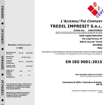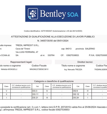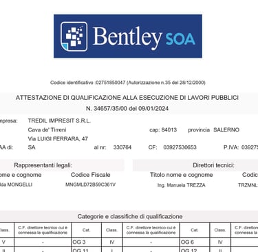 L’Impresa dispone di maestranze addestrate e preparate e di attrezzature moderne per soddisfare le diverse esigenze dei lavori, oltre all’ufficio per la gestione burocratica e amministrativa dispone di un deposito per mezzi e attrezzature. L’Impresa possiede l’attestato di qualificazione alla esecuzione dei Lavori Pubblici SOA per le categorie OG1 – OG3 – OG6 – OS7 - OG10 – OG11 – OG12 – OS21 – OS24 e l’attestazione del Sistema Qualità secondo le norme Europee UNI EN ISO 9001:2008 rilasciata da SI Cert ed è abilitata all’installazione, alla trasformazione, all’ampliamento e alla manutenzione degli impianti di cui all’ex art. 1 della Legge n.46/1990 (lettere A-B-C- D-E-F-G), attuale Decreto Legge 22/01/2008 n°37.