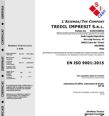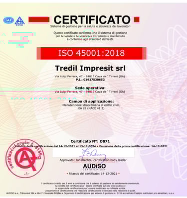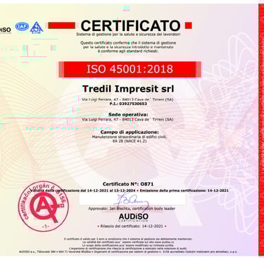 La direzione, nell'ottica del miglioramento continuo, e per essere sempre più rispondente ai requisiti legislativi, ha implementato all'interno della propria struttura un sistema gestionale che sia aderente alla ohsas 18001:07 e alla ISO 14001. L'implementazione di questi sistemi gestionali permetterà all’azienda di essere rispondente ai requisiti ambientali (impatti energetici, corretta gestione dei rifiuti e delle risorse energetiche) e di garantire la piena rispondenza a quanto previsto dal t.u. 81/08 e smi. Nell’anno 2017 ha ottenuto la Certificazione al Sistema ISO 14001:2015 con numero di Certificato 82337/A/0001/UK/IT rilasciato in data 15/05/2017 dall’ente URS. Nell’anno 2021 ha ottenuto la Certificazione al Sistema ISO 45001:2018 con numero di Certificato 0871 rilasciato da AUDISO
