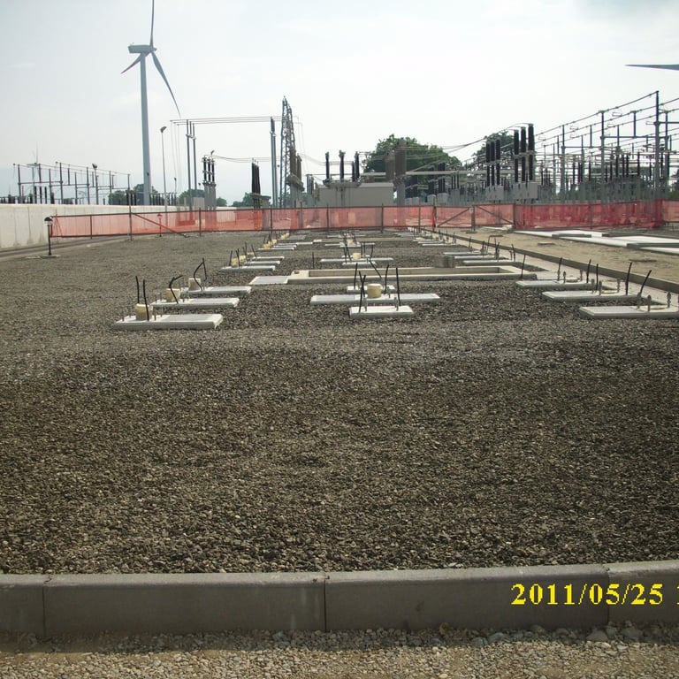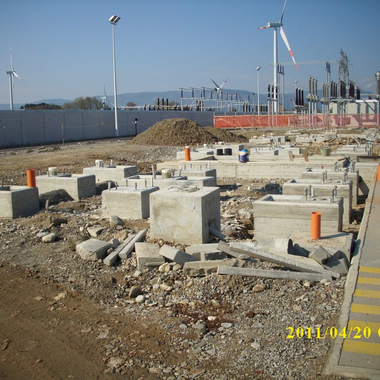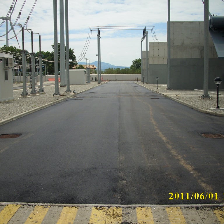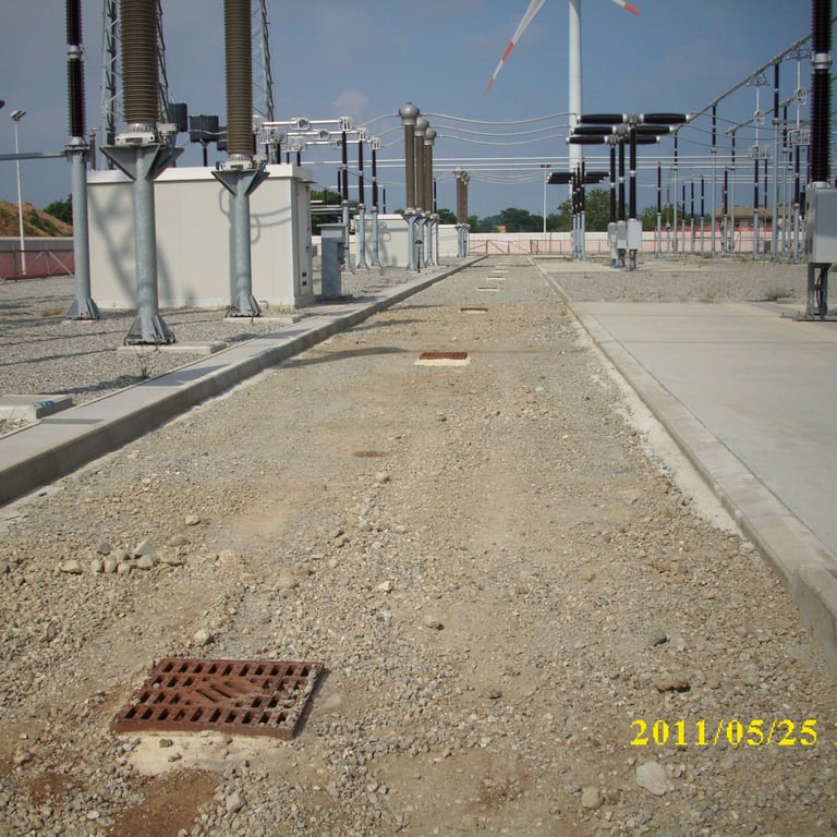 Terna Rete Italia Spa - Stazione 380/150 KV di Maida - Costruzione delle fondazioni comprensive dei cavidotti e rete di terra per n°4 stalli; completamento delle strade interne alla stazione con sottofondo in conglomerato bituminoso e tappetino di usura; finitura dei piazzali apparecchiature dei 4 stalli eseguiti con ghiaietto di frantoio; Inerbimento e piantumazione di alberi e cespugli nelle aree esterne alla stazione elettrica; Installazione di rete metallica plastificata per delimitare il confine di proprietà Terna; posa di canaletta prefabbricata in c.v. corredata da pozzetti per il drenaggio delle acque piovane provenienti dall'area esterna della stazione; posa dei cavidotti e pozzetti per fibre ottiche e alimentazione elettrica dall'edificio comandi alla torre Wind; ripristino della viabilità originaria sulla strada lato N-O e ripristino del fondo attiguo danneggiato dalla strada provvisoria.
